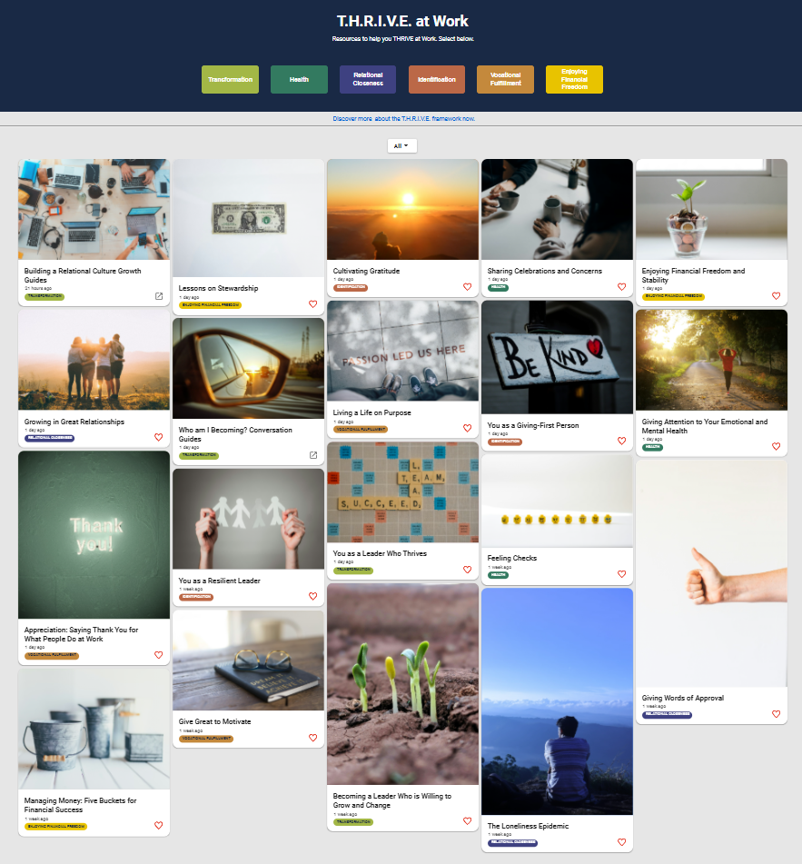 - a gateway to comprehensive professional development through the THRIVE Course Catalog. Access a robust digital course catalog featuring 9+ carefully curated courses that address the Six Dimensions of THRIVE, each designed to unlock your full potential as a leader. Choose flexibility with on-demand online courses that fit your schedule or deepen your learning through facilitated sessions available both in-person and online for collaborative growth. Whether you're navigating complex relational dynamics, strengthening your spiritual foundation, building resilience, or clarifying your organizational vision, these courses provide the strategic insights and practical tools you need.